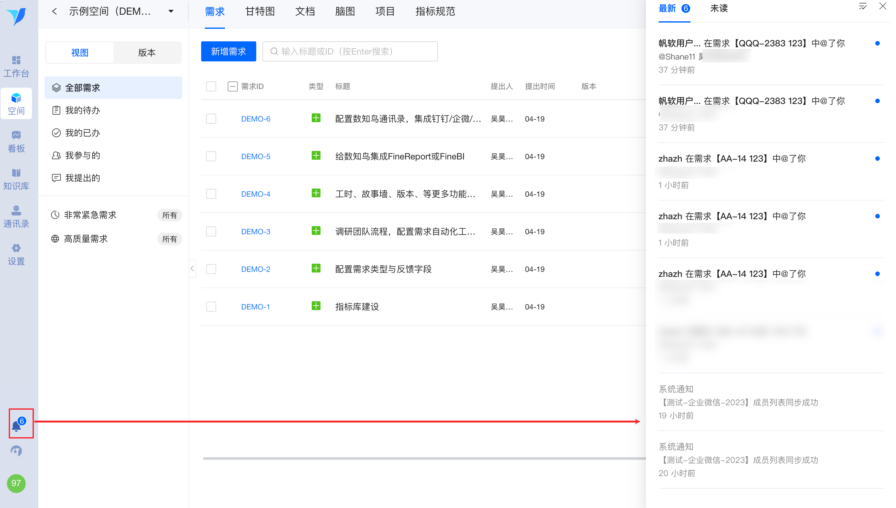 平台内消息通知模块支持推送“系统”、“需求”及“文档”消息,其中需求消息又可区分为待办需求的状态变更、超期需求的提醒、参与需求的状态变更、@我的。