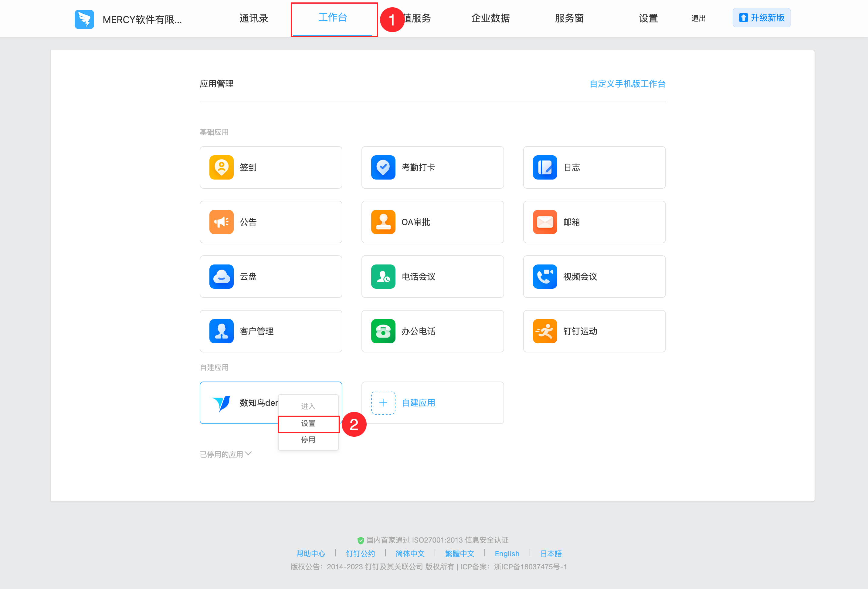 钉钉管理员登录钉钉管理后台,工作台>“数知鸟”应用>「设置」
