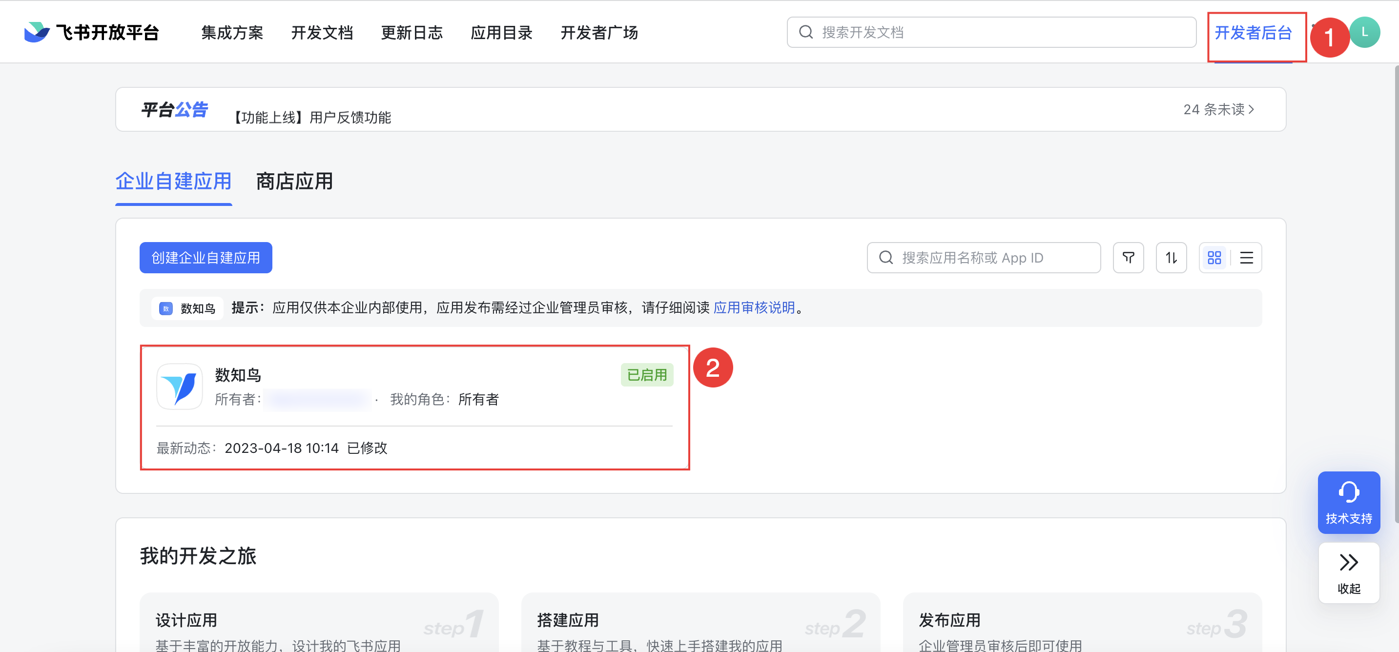 登陆飞书管理后台,开发者后台>“数知鸟”应用