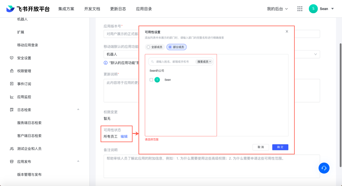 点击「部署与发布」>「版本管理与发布」,在出现的弹窗中选择可使用的成员,完成后点击「确认」>「保存」