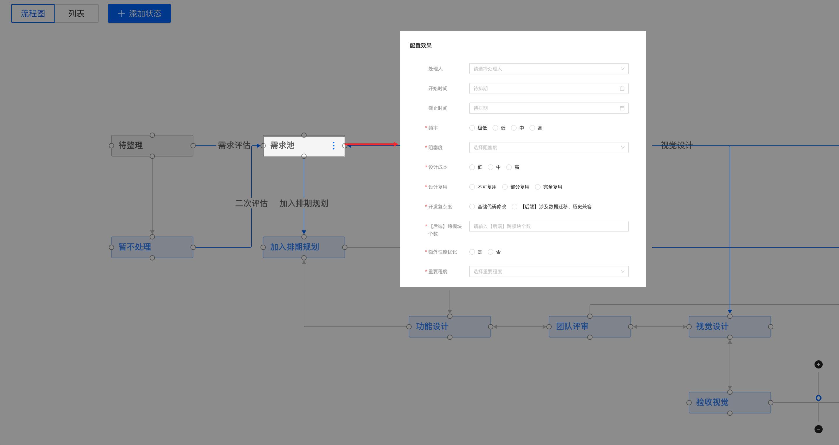 例如,将“需求池”设为需求评估节点,并设置流转至该节点时需从“频率”/“阻塞度”/“设计成本”/“设计复用”/“开发复杂度”/“【后端】跨模块个数”/“额外性能优化”/“重要程度”的维度对需求进行评估