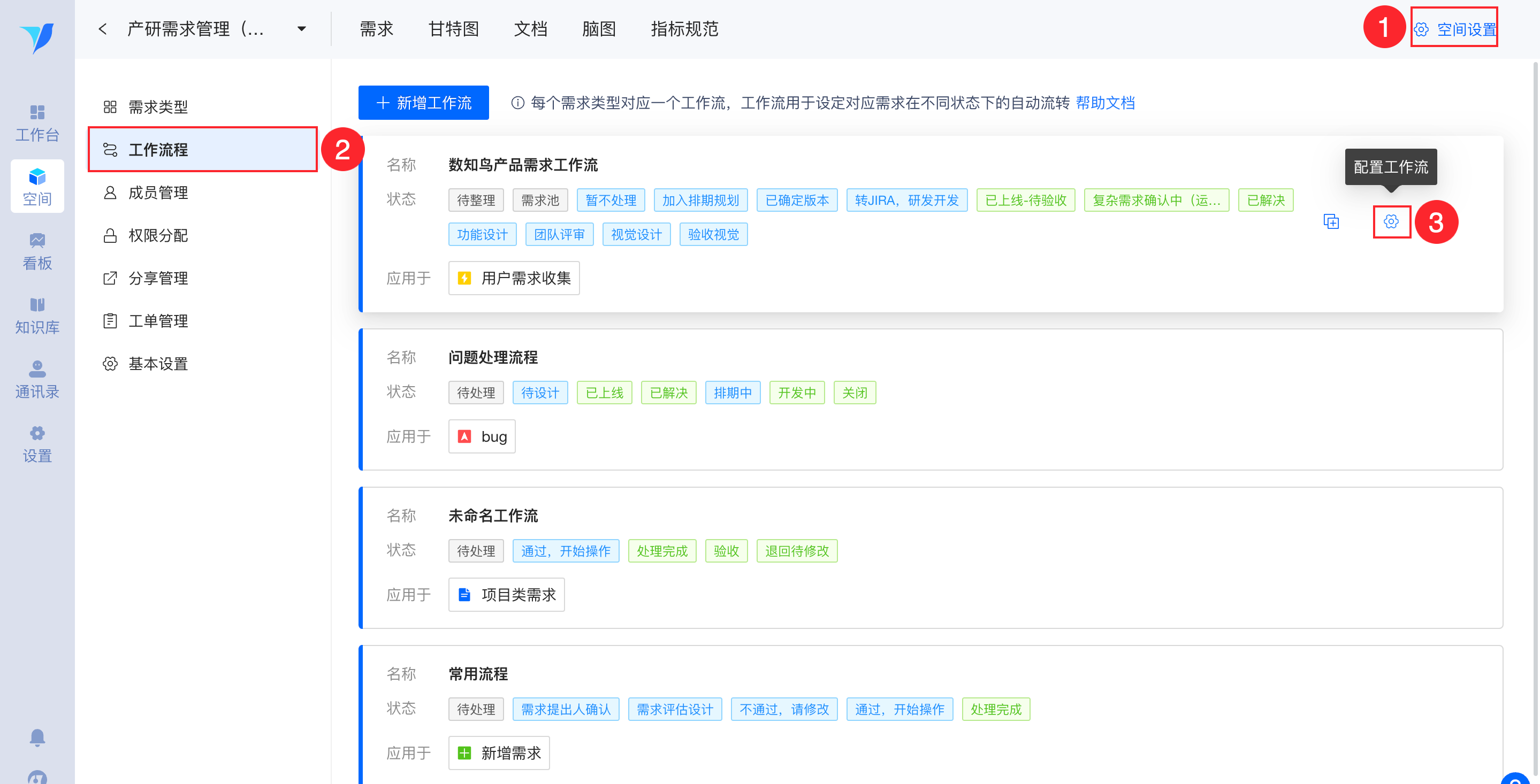 「空间设置」>「工作流程」中,选择一工作流,将产品对需求的评估阶段单独设置为节点,并设定评估维度