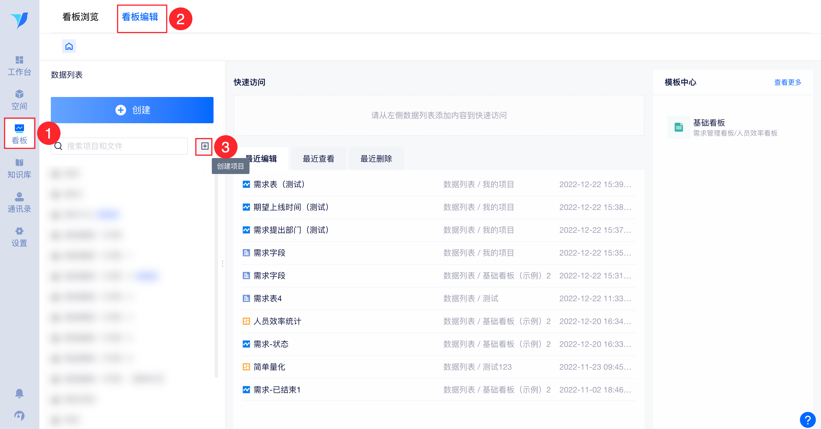 「看板」>「看板编辑」>创建项目,命名为“产品需求评估看板”
