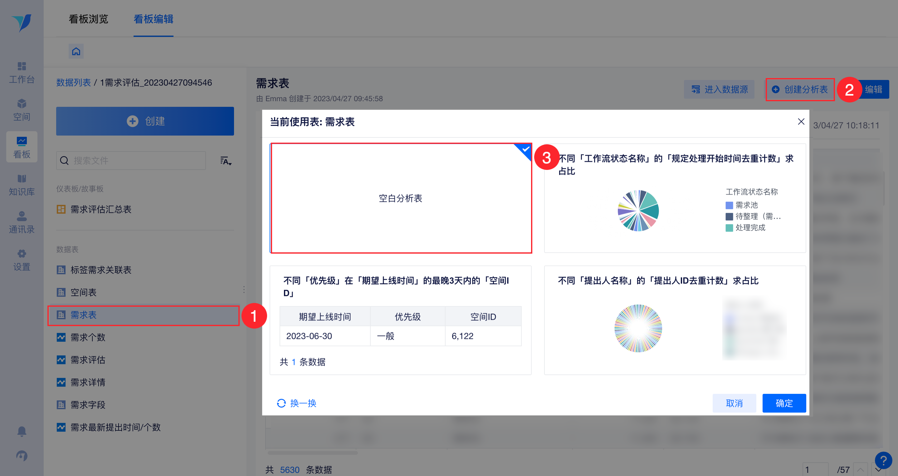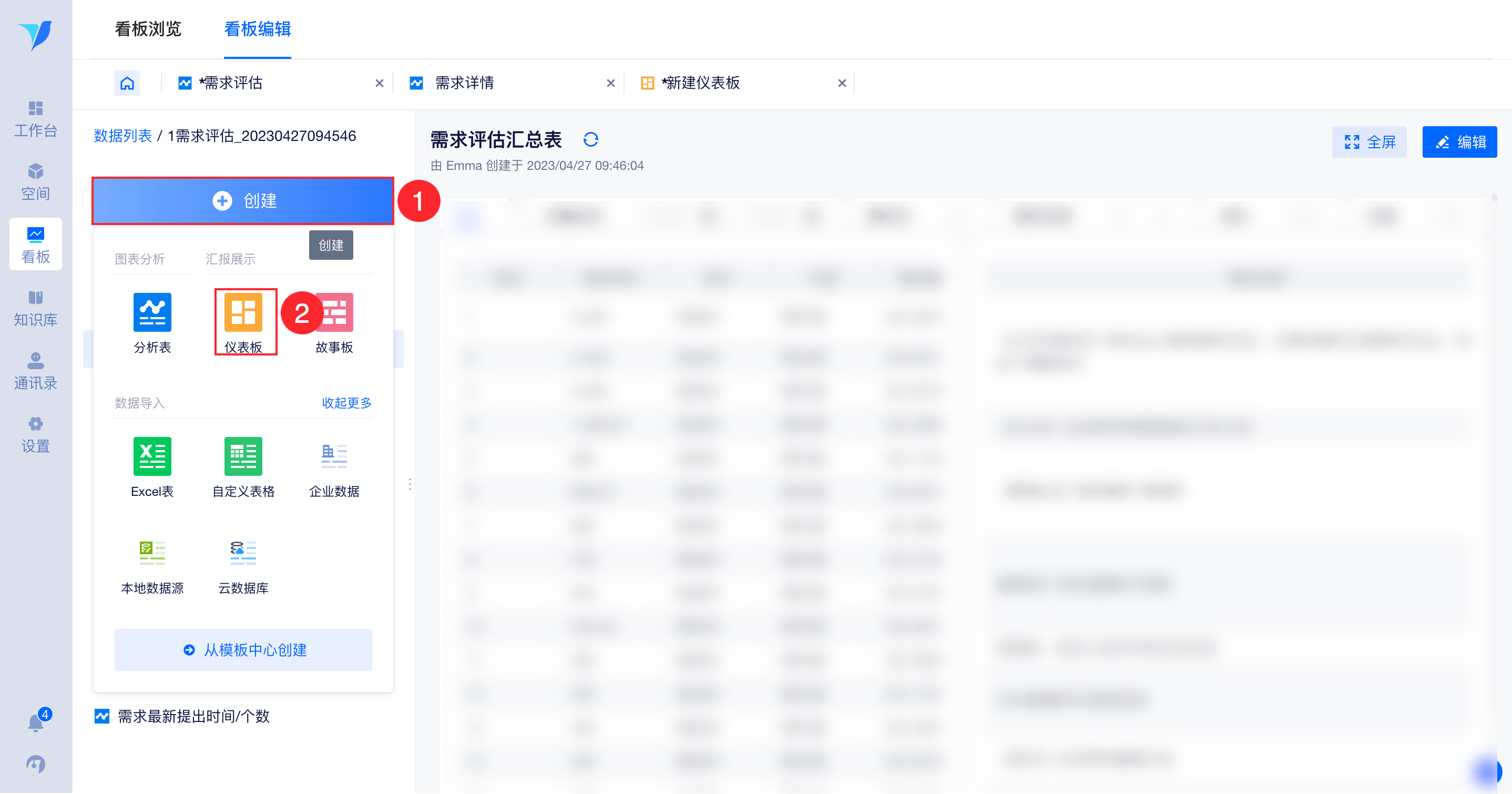 因此,我们在「看板」>「看板编辑」>「创建」-企业数据-选取表>「添加到项目」