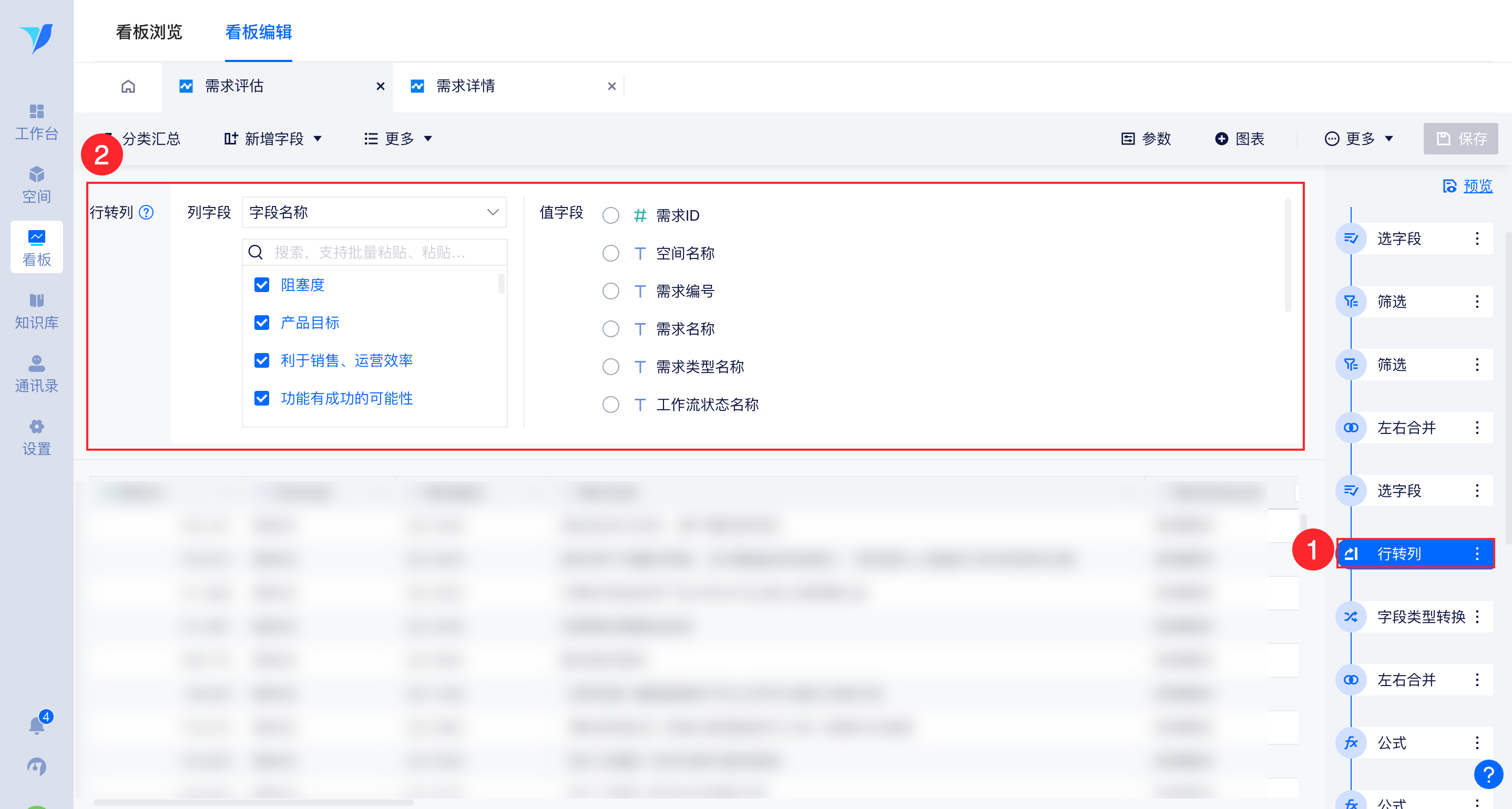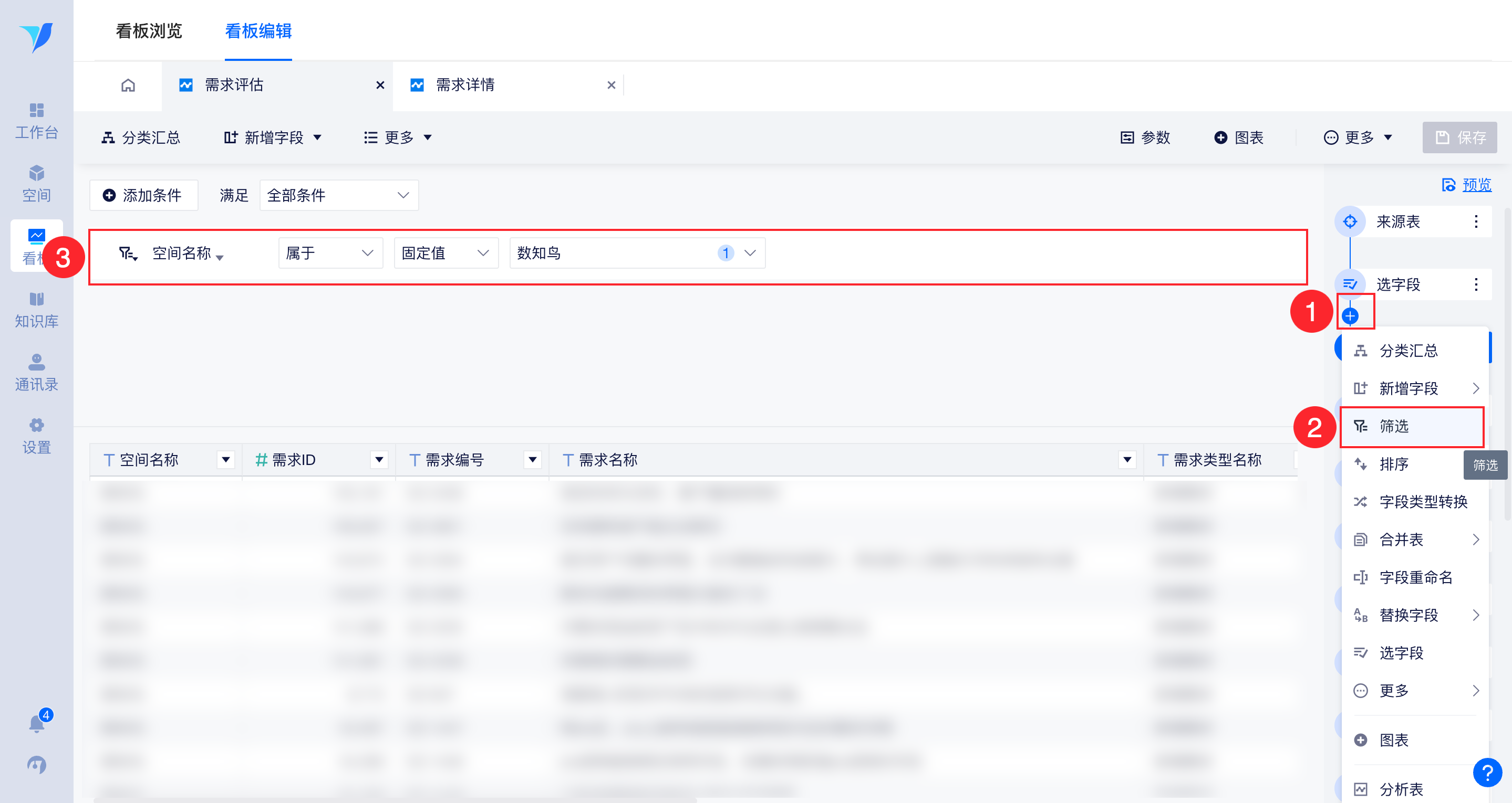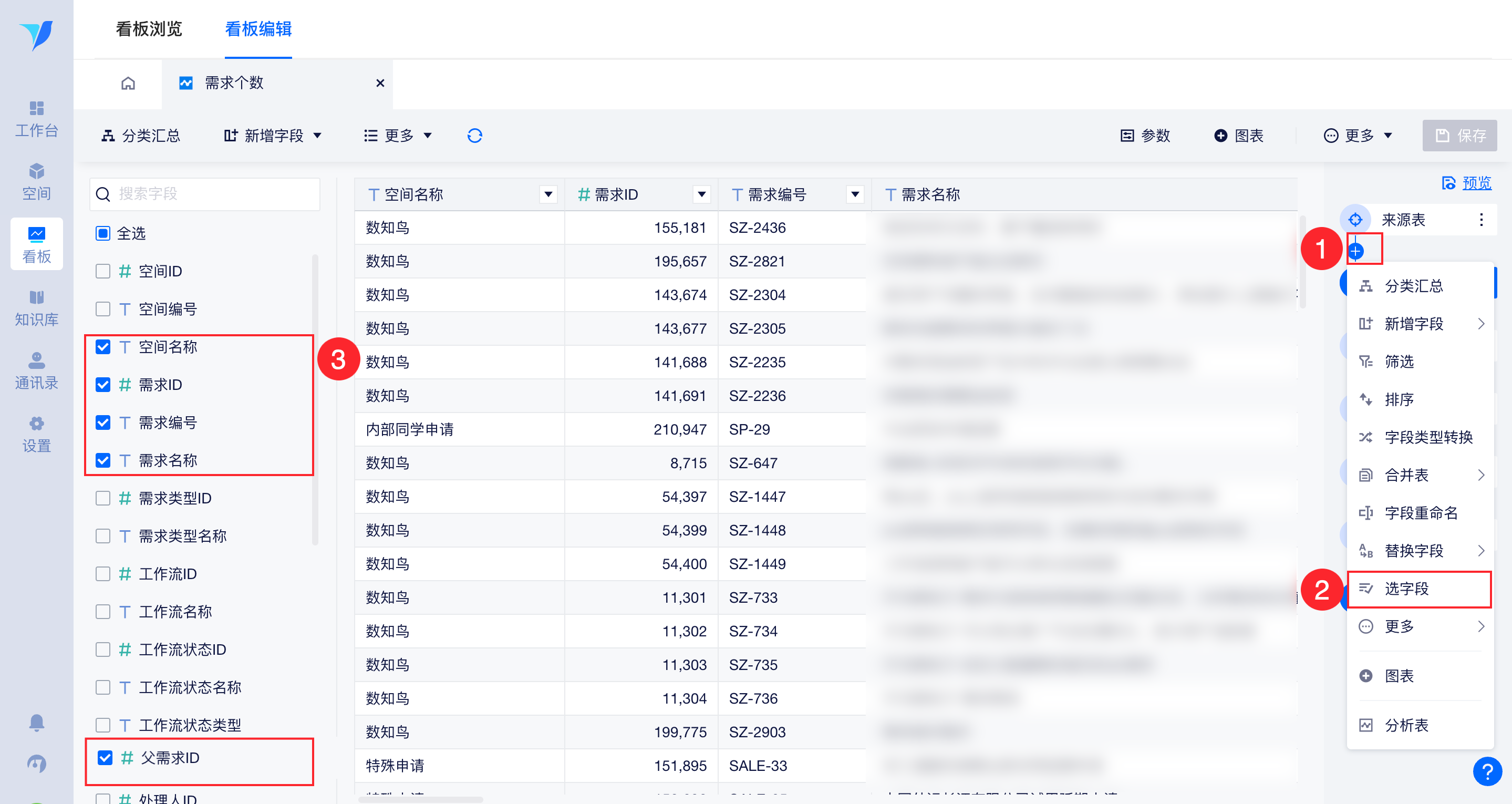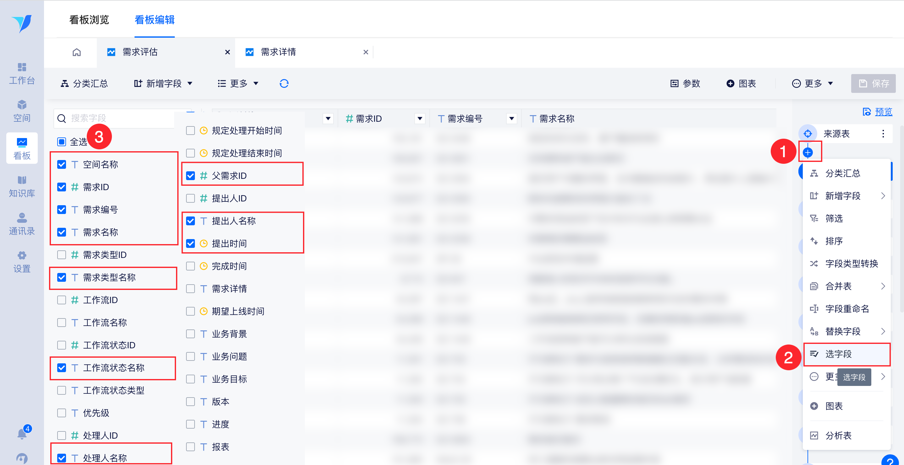 「+」>「选字段」>选择空间名称、需求id、需求编号、需求名称、父需求id
