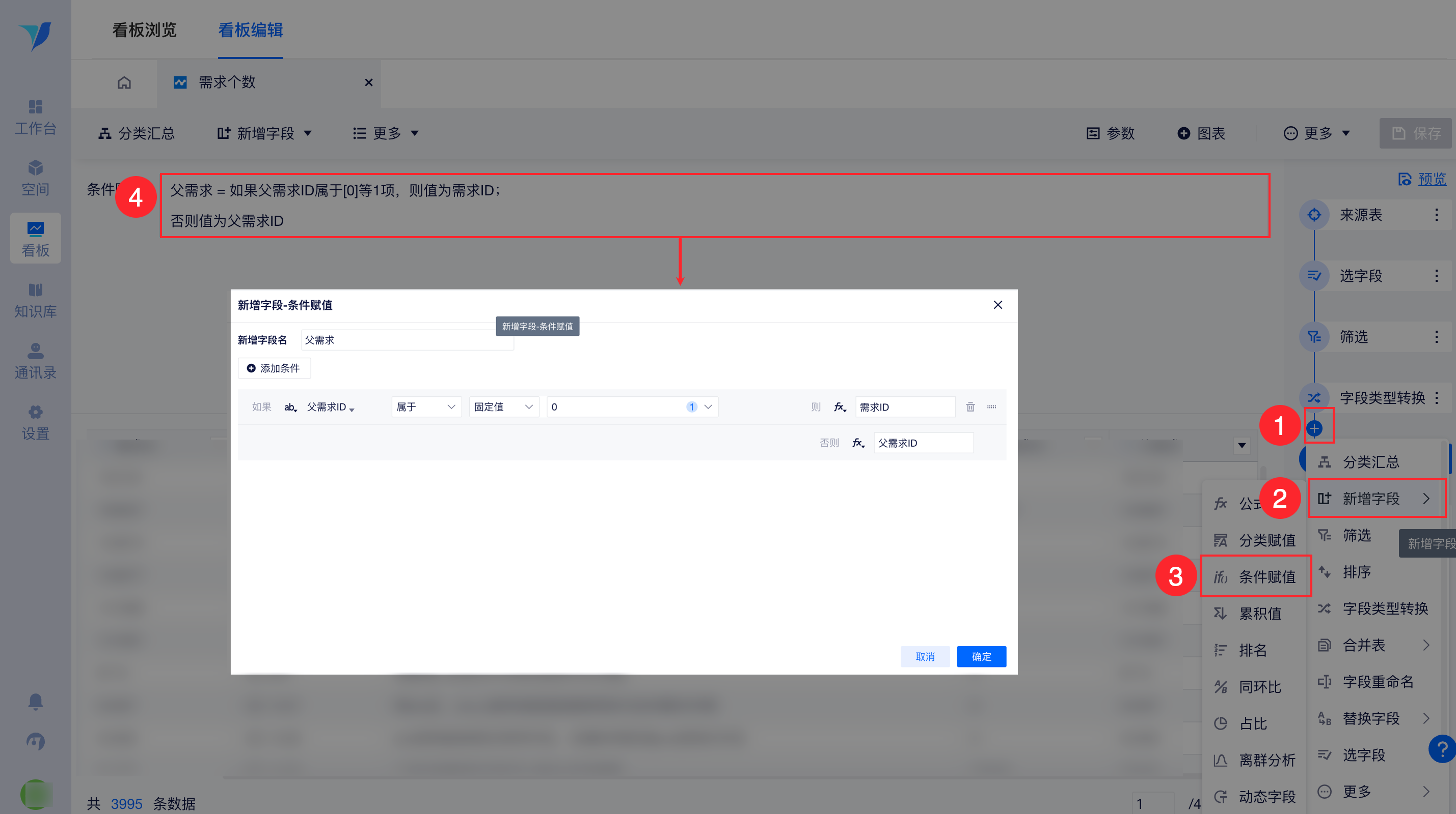 「+」>「新增字段」>「条件赋值」,当需求有父需求的时候,记录为父需求id,当没有父需求时,记录为本需求id