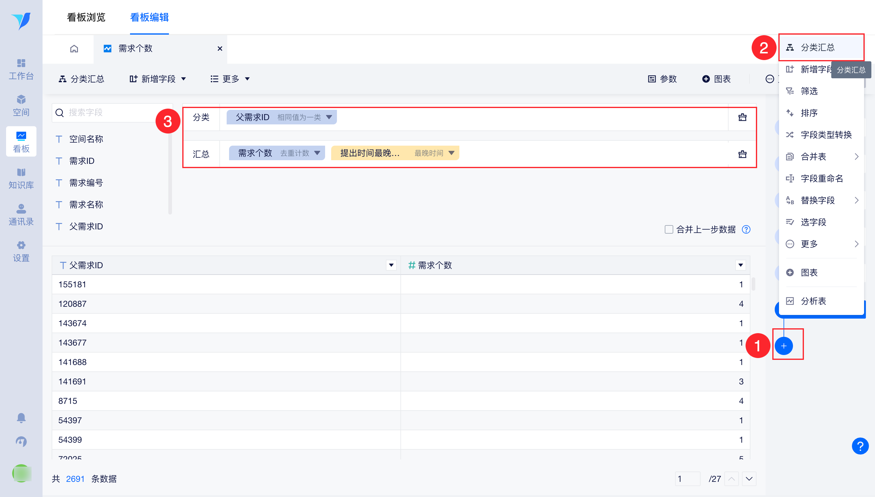 「+」>「分类汇总」,计算父需求对应的需求个数和最晚提出时间