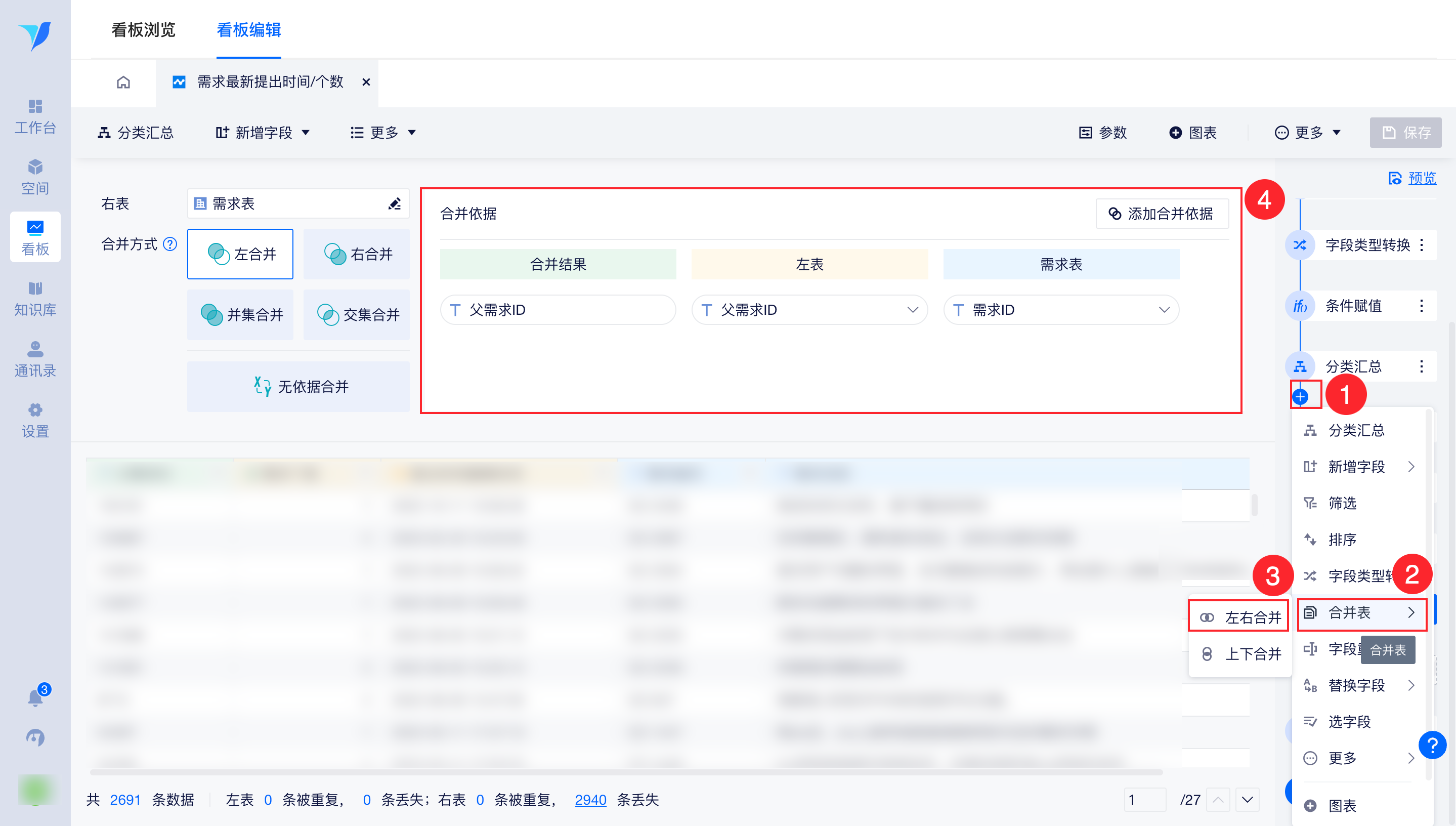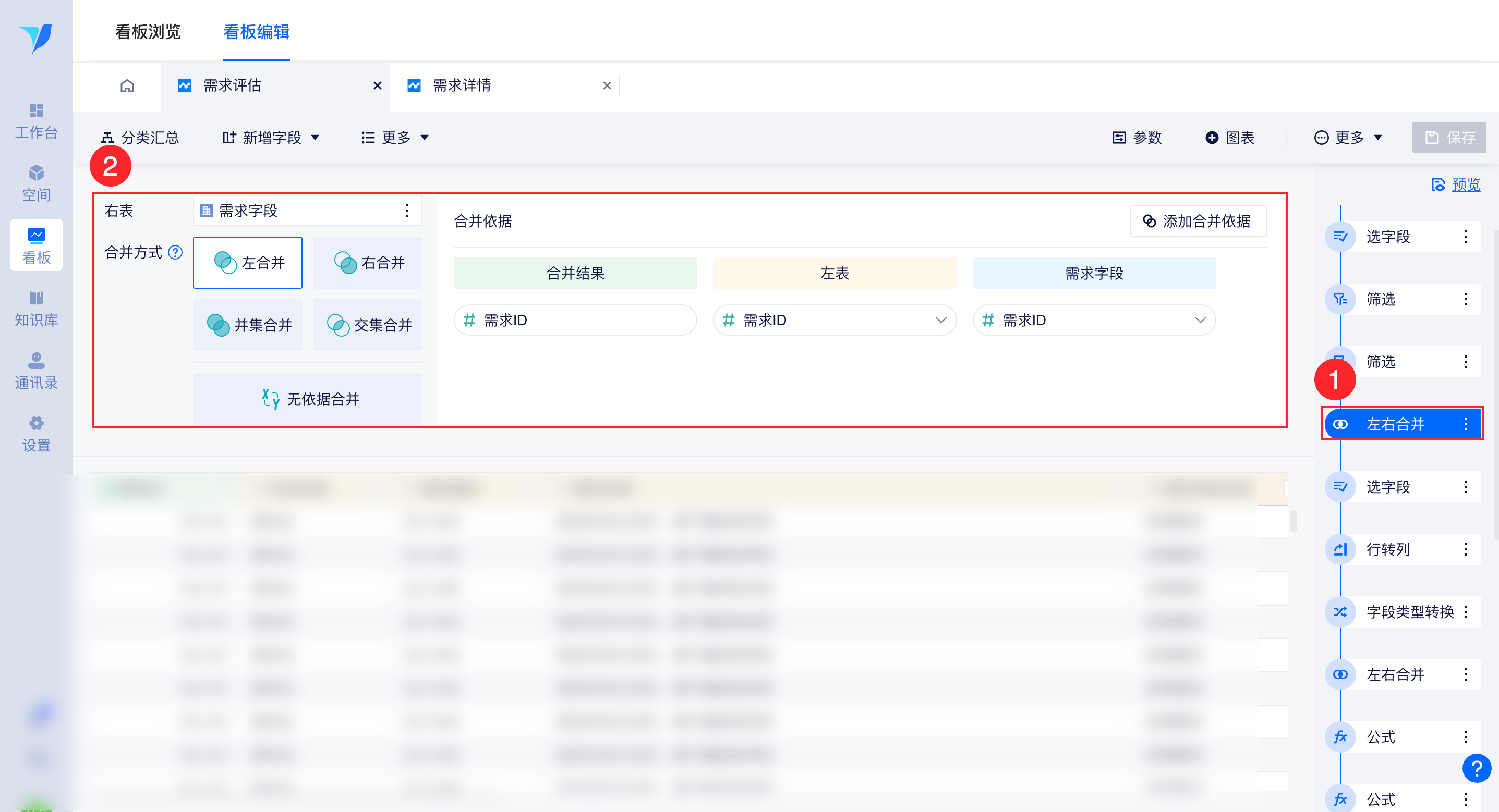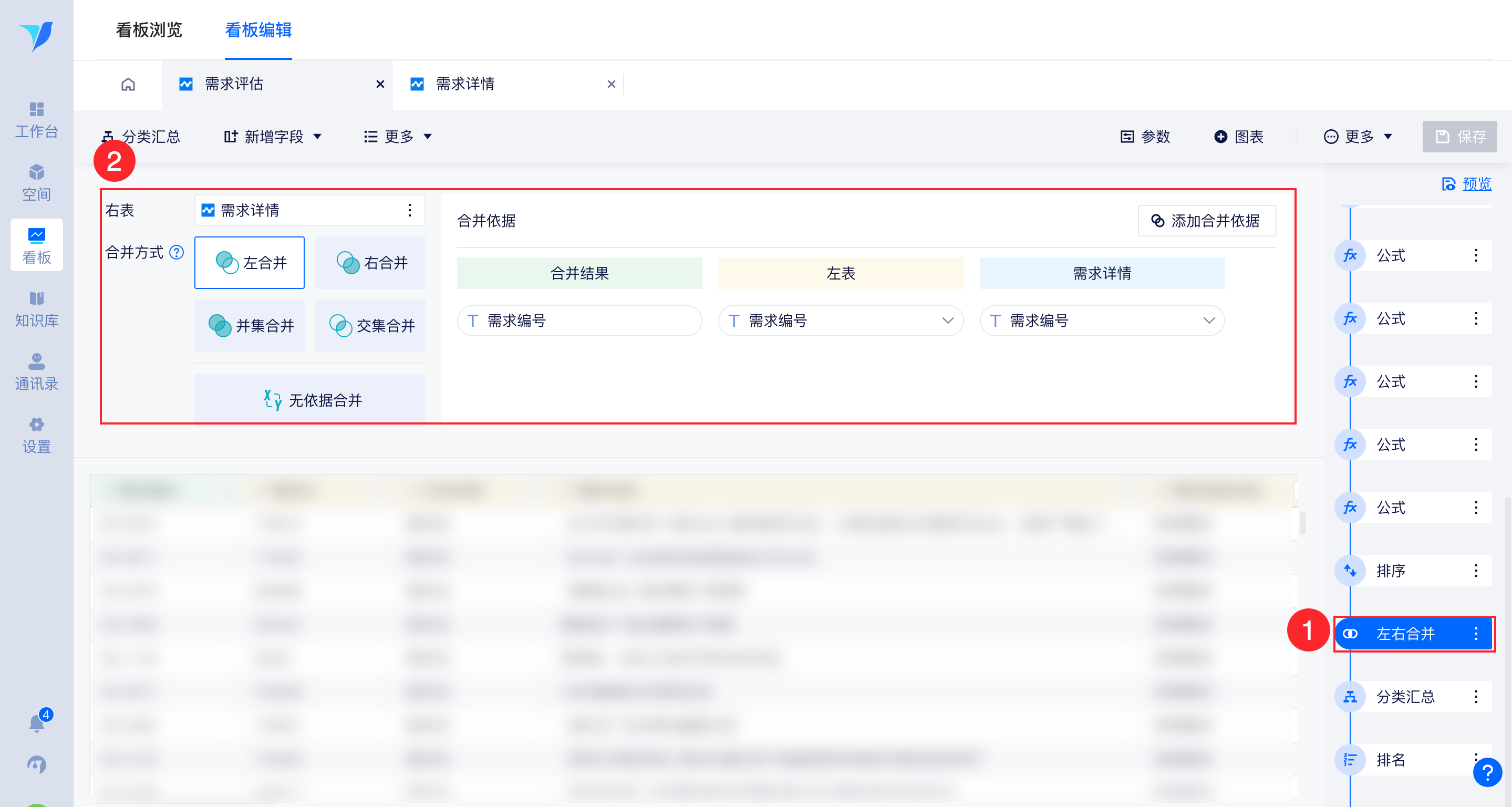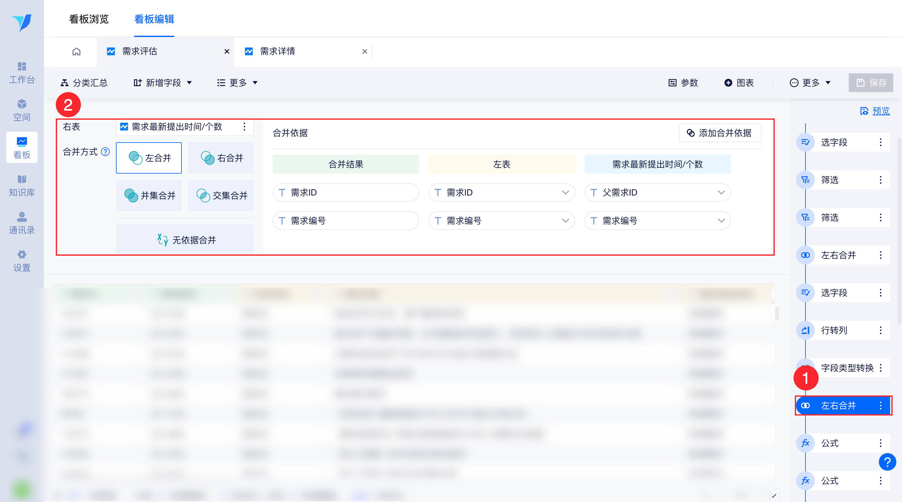 「+」>「合并表」>「左右合并」,与“需求表”进行左合并,获取需求编号、需求id等内容