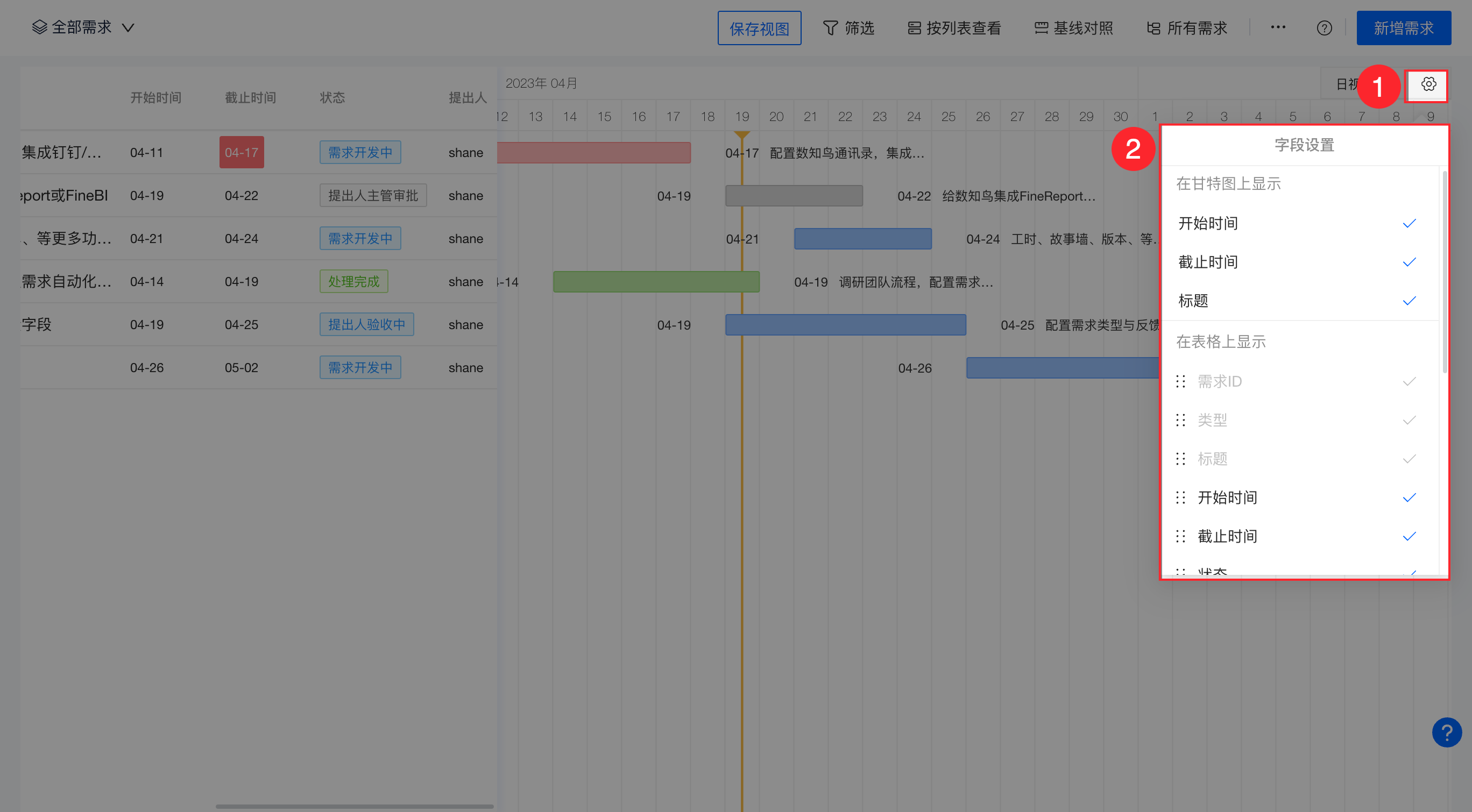 点击右上角「设置」图标可以设置“在甘特图上显示”和“在表格上显示”的字段。