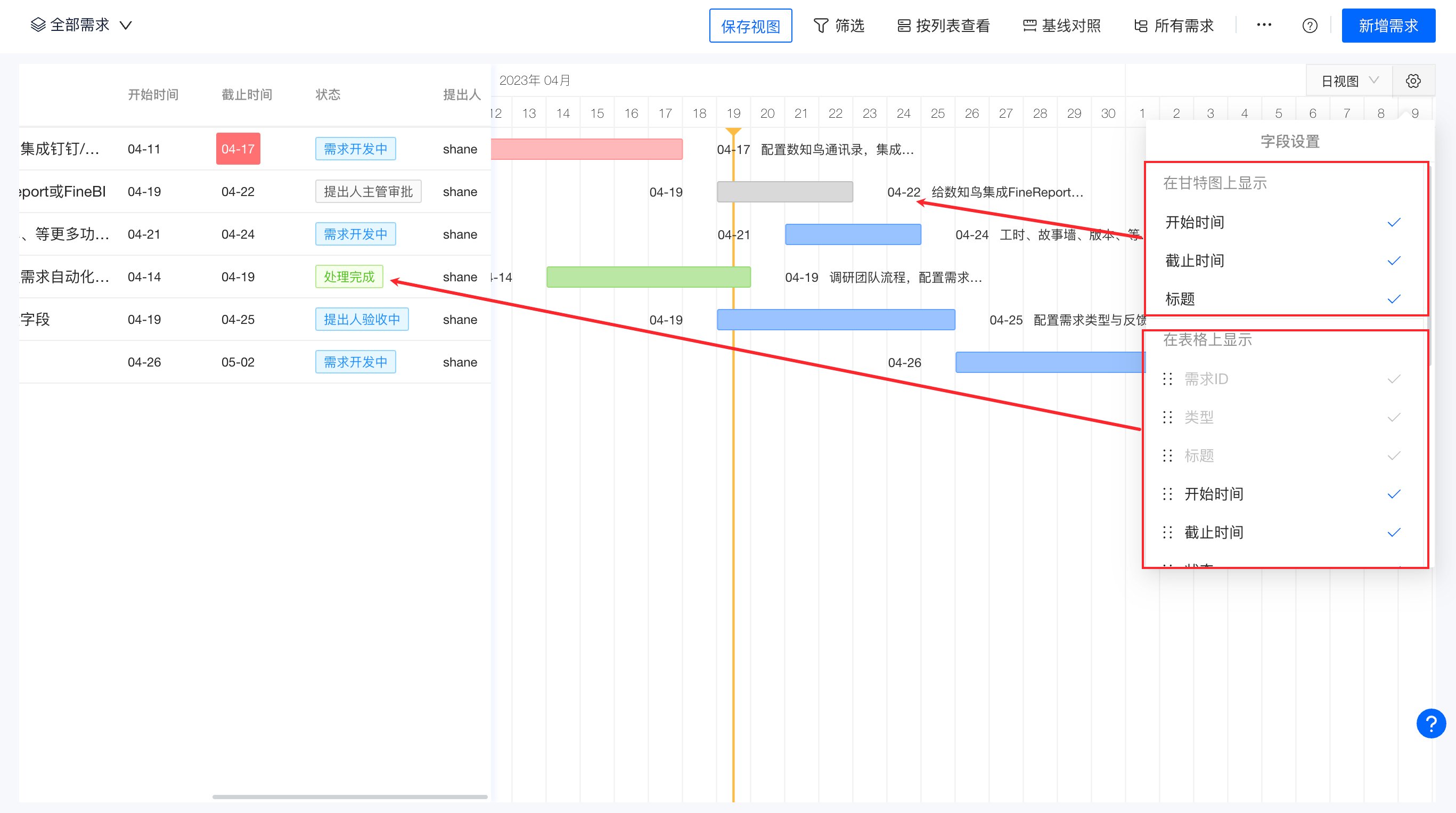 甘特图中可设置显示“开始时间”、“截止时间”和标题,表格中显示内置字段和自定义字段
