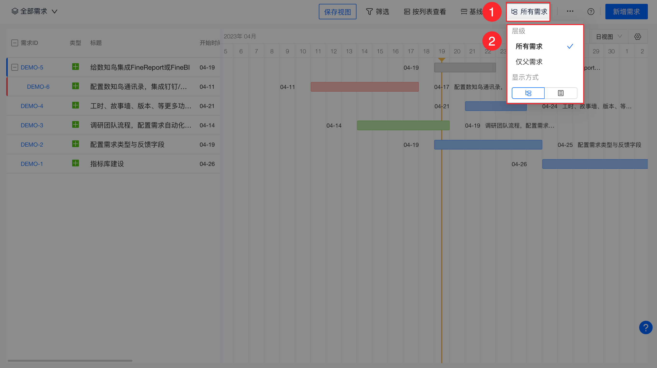 可设置显示所有需求还是只显示父需求,也可以选择树形结构或平铺结构