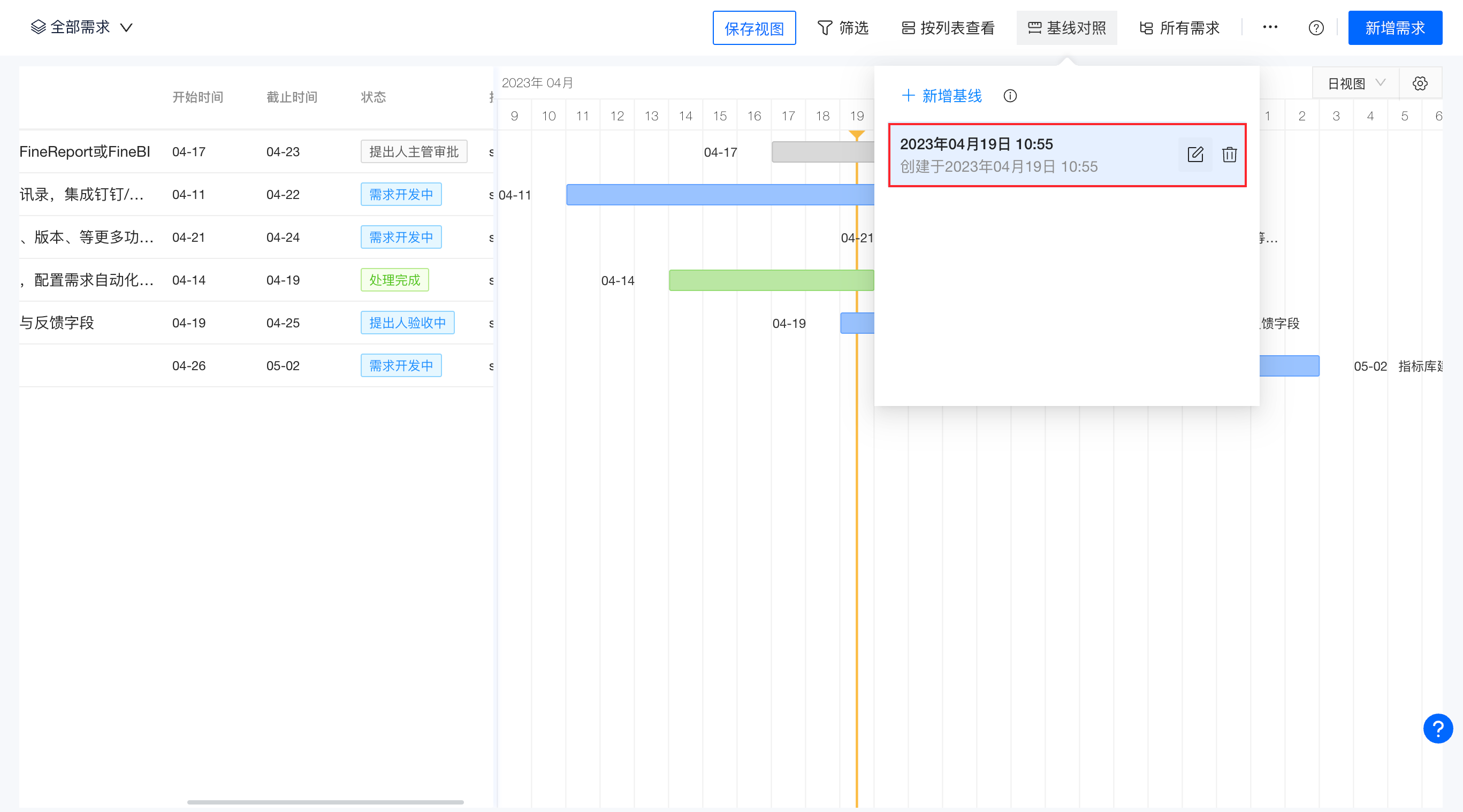 进入甘特图界面,点击页面右上角【基线对照】,新增基线,默认基线名称为当下时间点,也可编辑基线名称,点击空白区域即可新建完成。