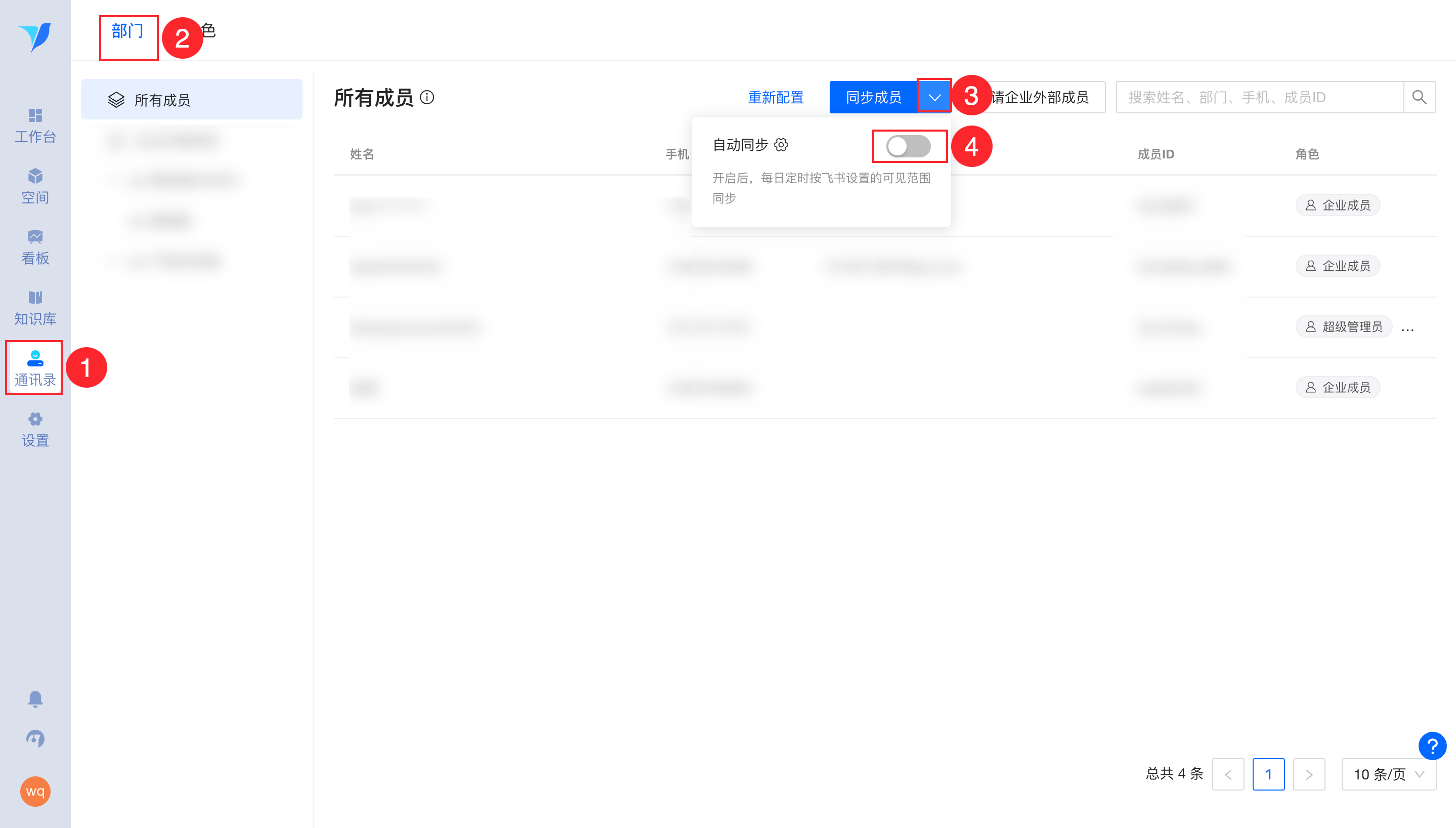 飞书集成模式下,开启自动同步功能,实现通讯录发生变化时、自动同步成员的效果,解决入离职、组织架构变动问题,具体可参照帮助文档