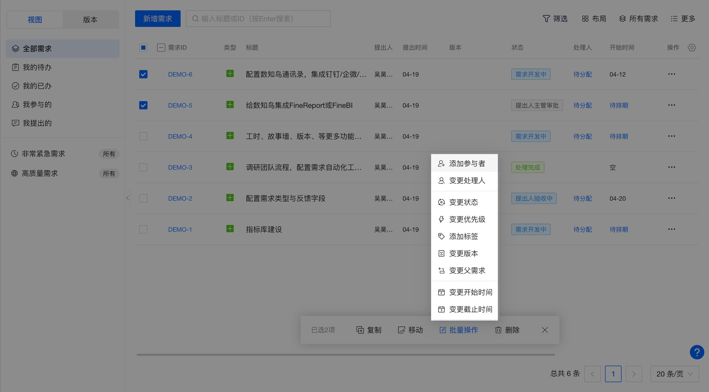 支持批量变更状态、变更优先级、添加标签、变更版本、变更父需求、变更开始时间、变更截止时间,支持更多维度的需求批量处理、提升同类型需求的处理效率,具体可参照帮助文档
