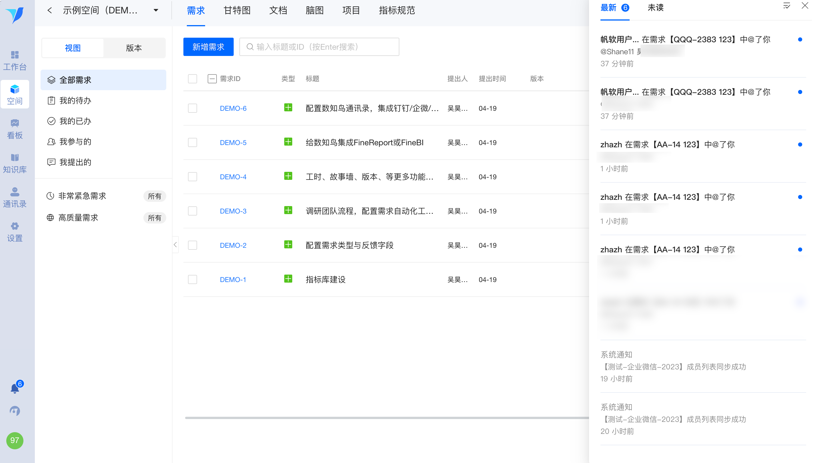 将「需求管理」「脑图管理」「项目管理」归属于空间下,更方便您进行空间化管理与数据隔离。