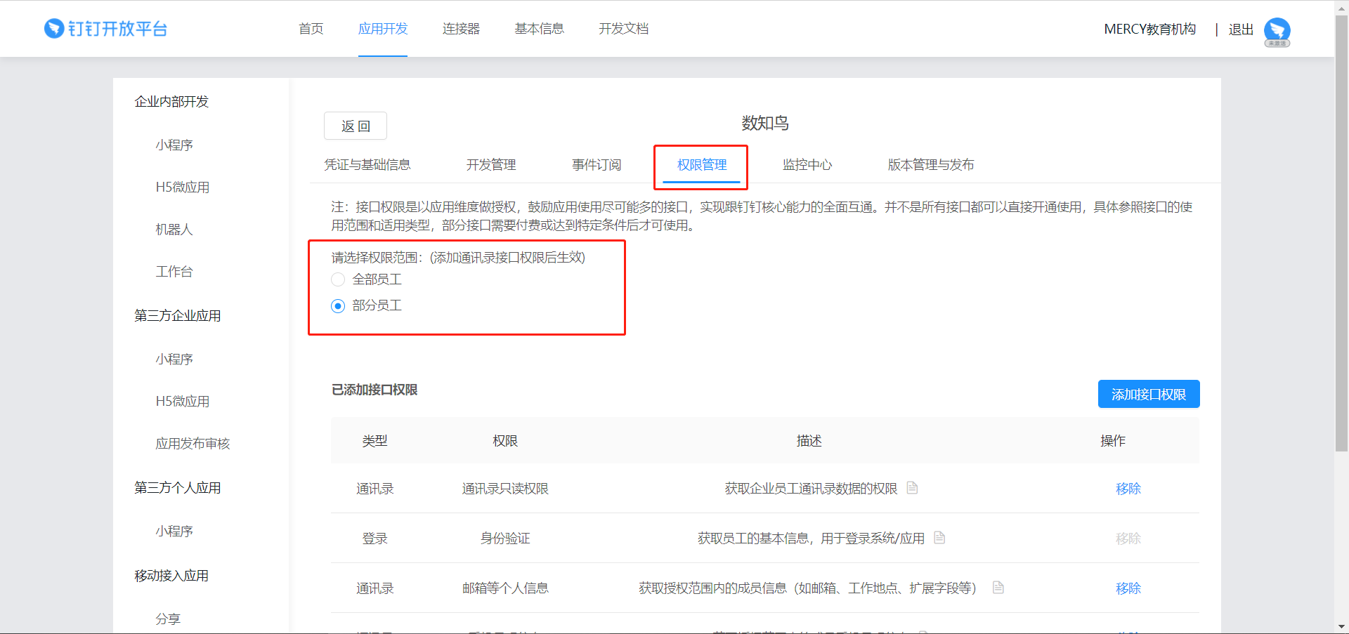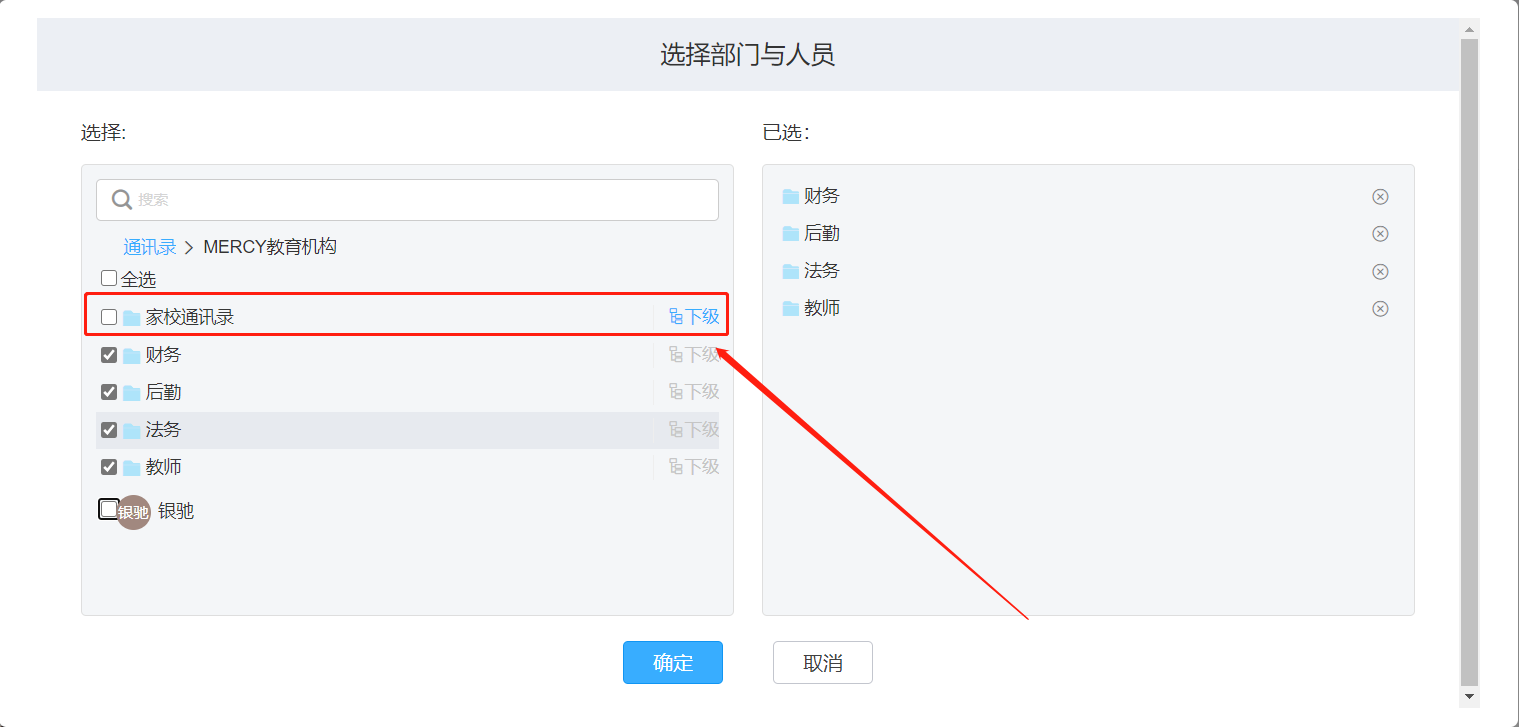 由于【家校通讯录】的人员严格来说并不是企业内部员工,在集成钉钉时,设置权限范围时望多加注意