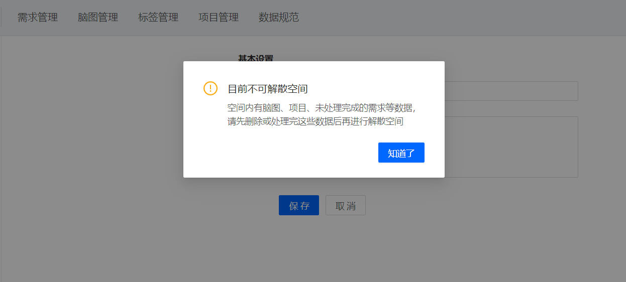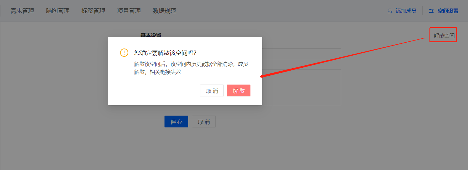 当空间内有脑图、项目、未处理完成的需求等数据,不可解散空间