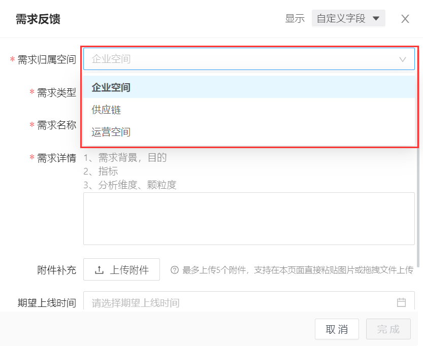 注:需求反馈时显示的字段提示可由企业管理员自定义,具体操作点击跳转