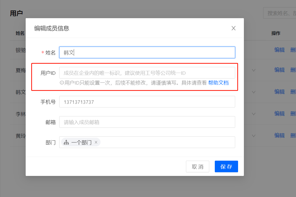 用户ID为成员在企业内的唯一标识,建议使用工号等公司统一ID。用户ID只能设置一次,后续不能修改,请谨慎填写。