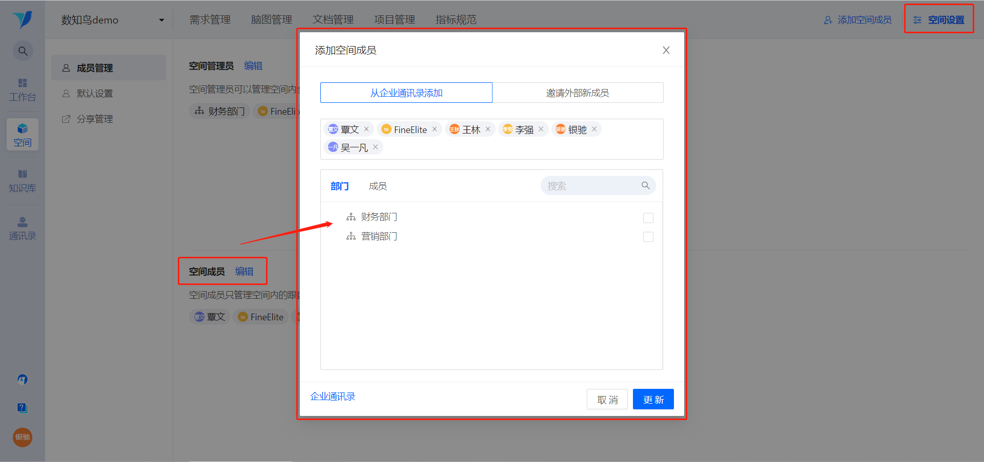 添加空间小伙伴,支持添加企业通讯录的成员和邀请外部新成员,空间内邀请进来的成员会同时在空间成员目录和企业通讯录里。