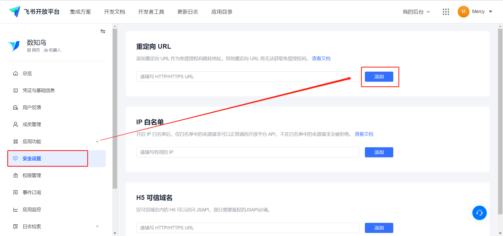 将数知鸟提供的重定向URL字段填写至飞书,点击添加
