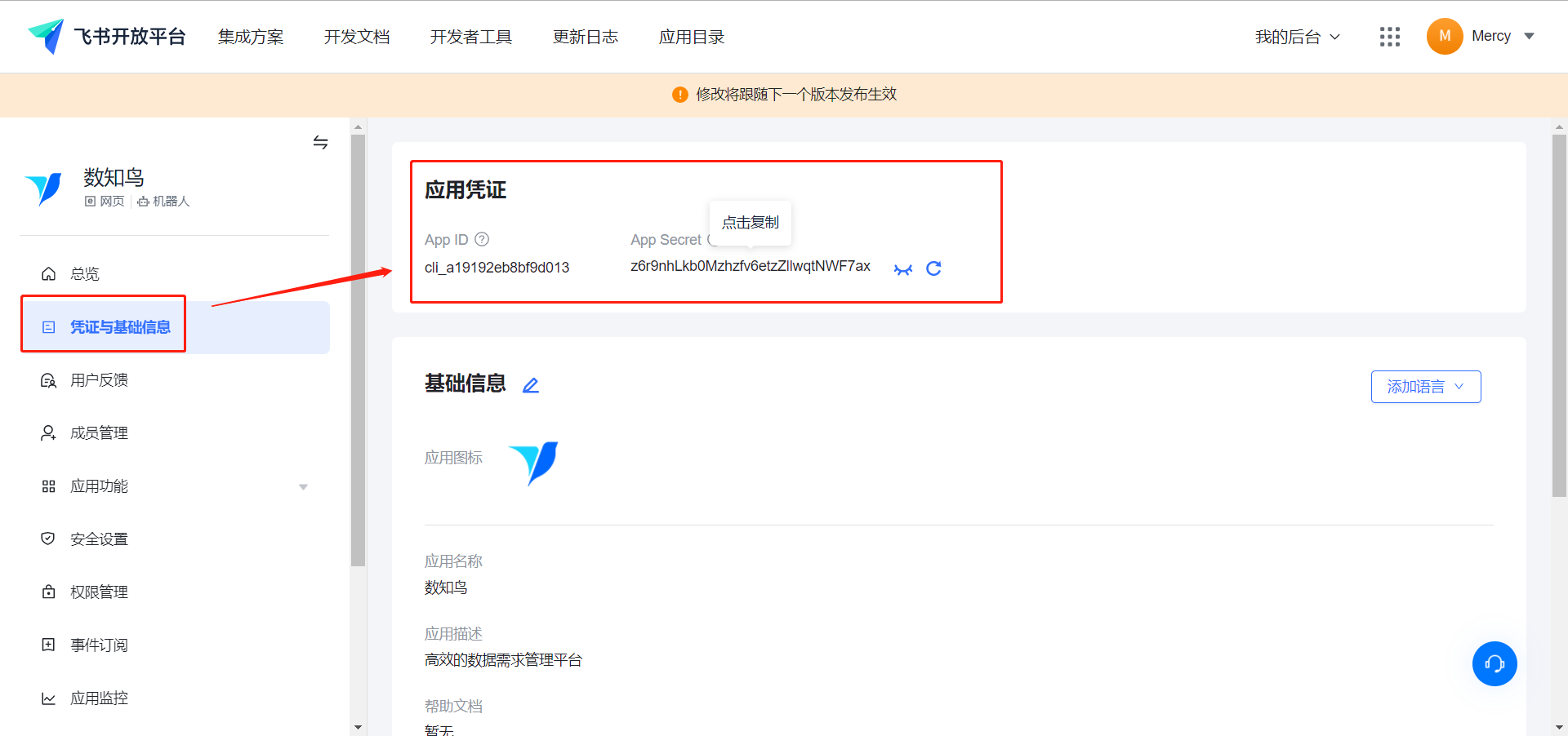创建成功后,需要在飞书开放平台对”数知鸟“应用进行必要配置,并填写数知鸟提供的以下3个字段信息
