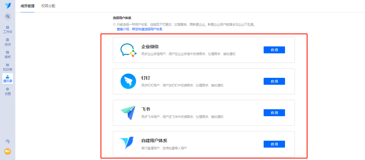 数知鸟的通讯录支持四种用户体系(点击即可跳转查看集成详细集成操作):企业微信用户体系、钉钉用户体系、飞书用户体系、自建用户体系。