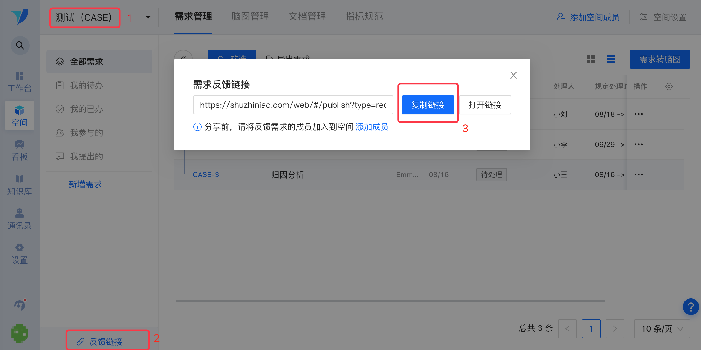 空间拥有者和管理员在空间内复制并发布反馈链接