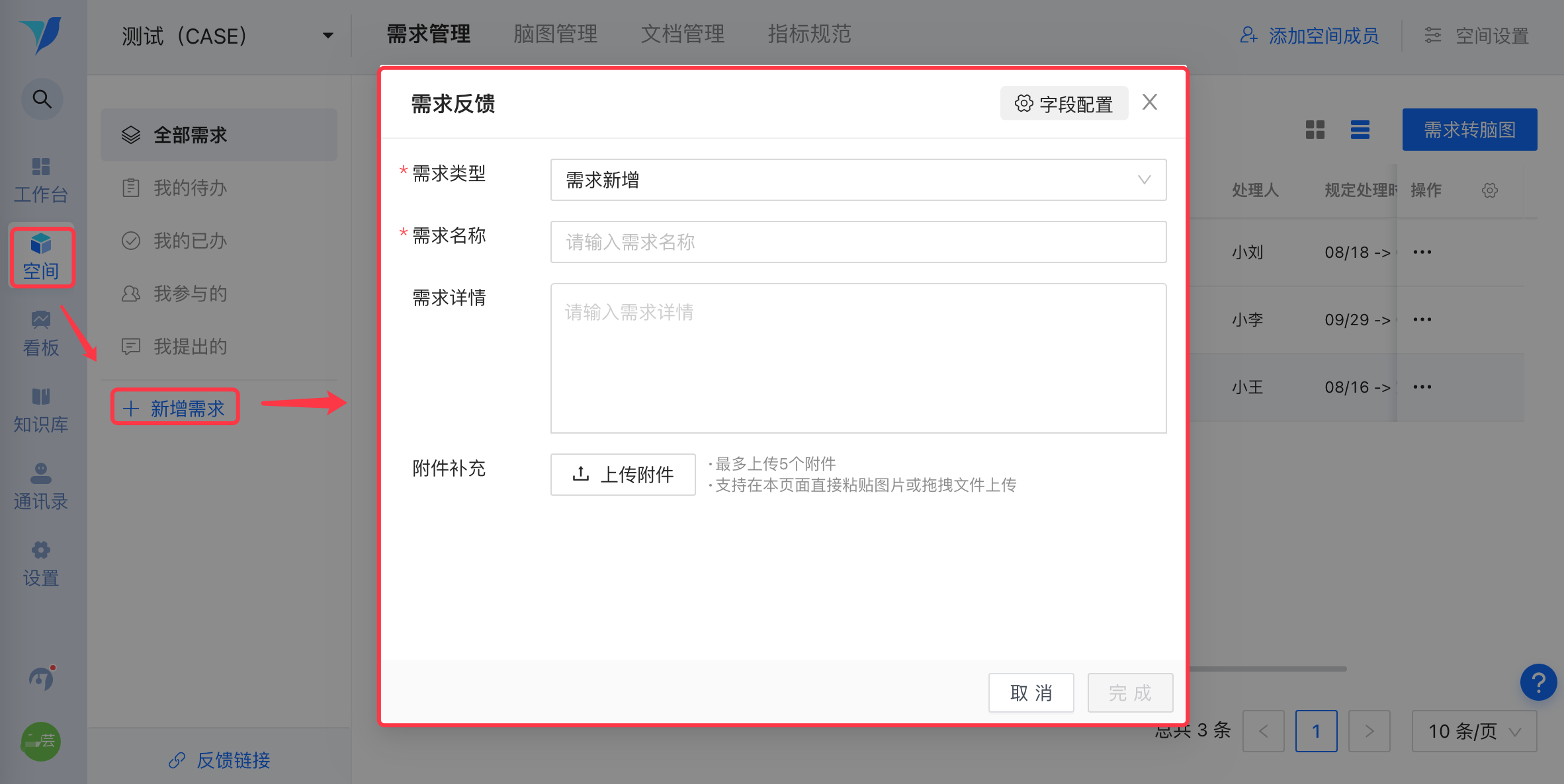 在【空间】内点击【新增需求】即可进行需求反馈,需求类型需要提前进行设定。