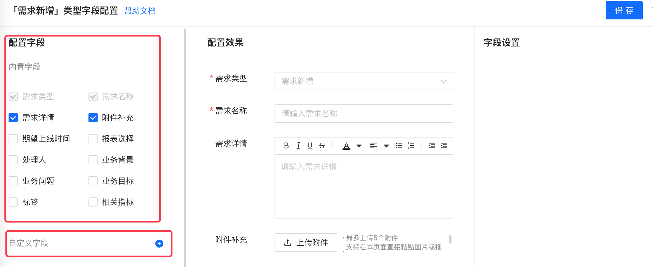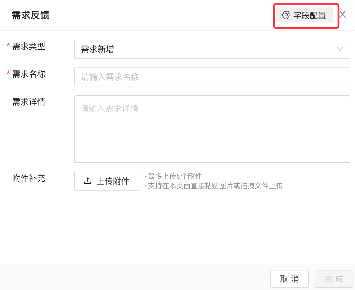 若管理员选定【需求新增】类型,需要调整自定义字段,则需点击【需求反馈】右上角的【字段配置】