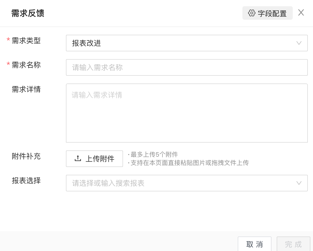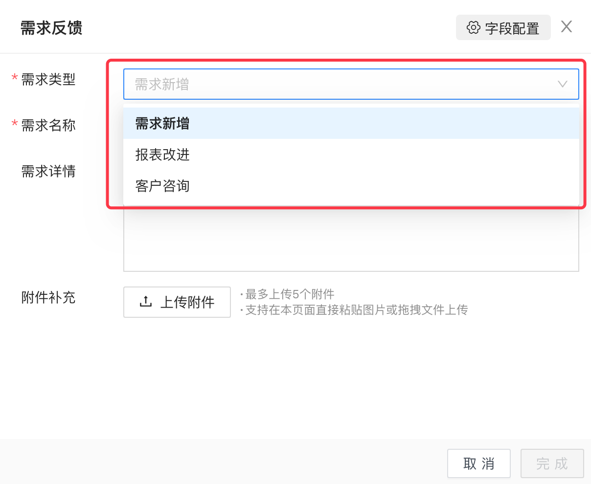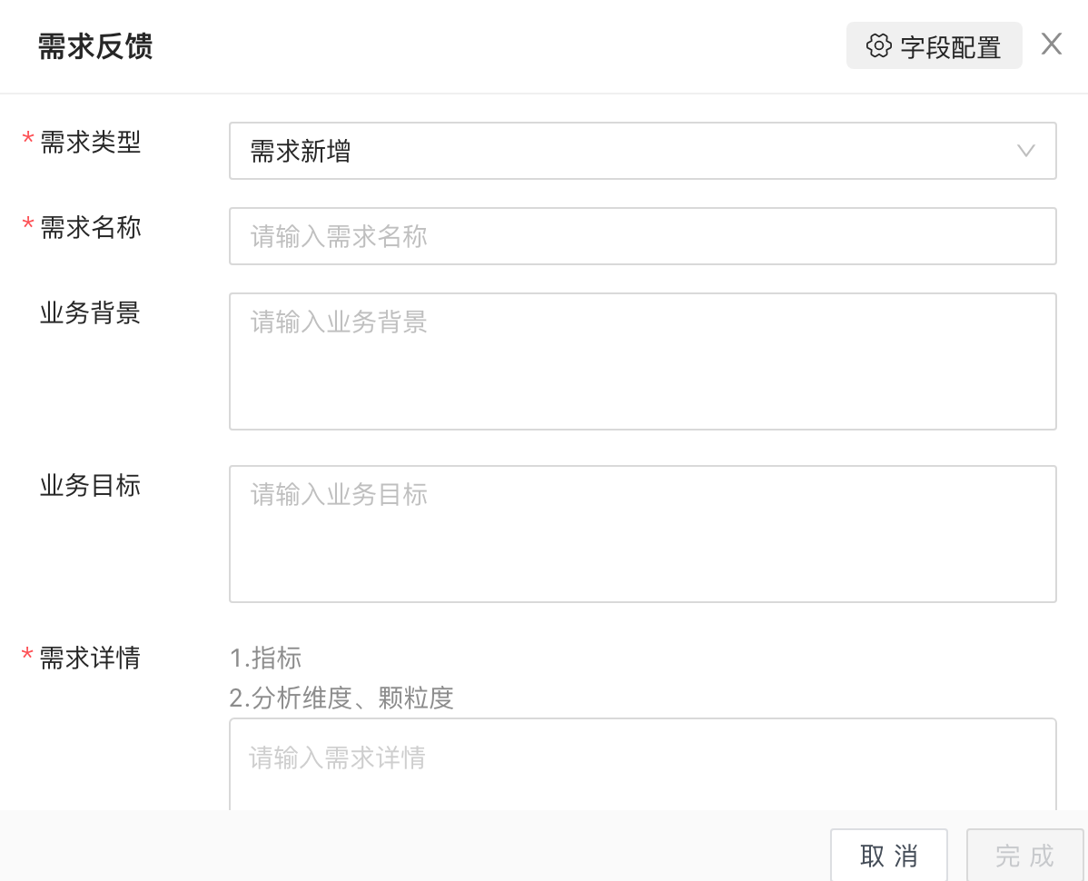 注:需求反馈时显示的字段提示可由企业管理员自定义,具体操作点击跳转