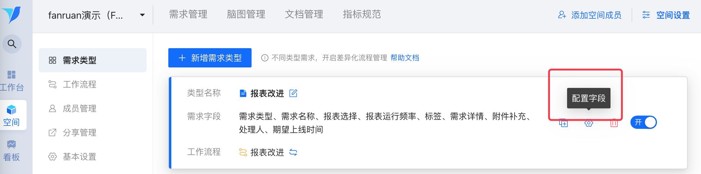 【空间设置】->>【需求类型】->>选择需要修改的类型【配置字段】